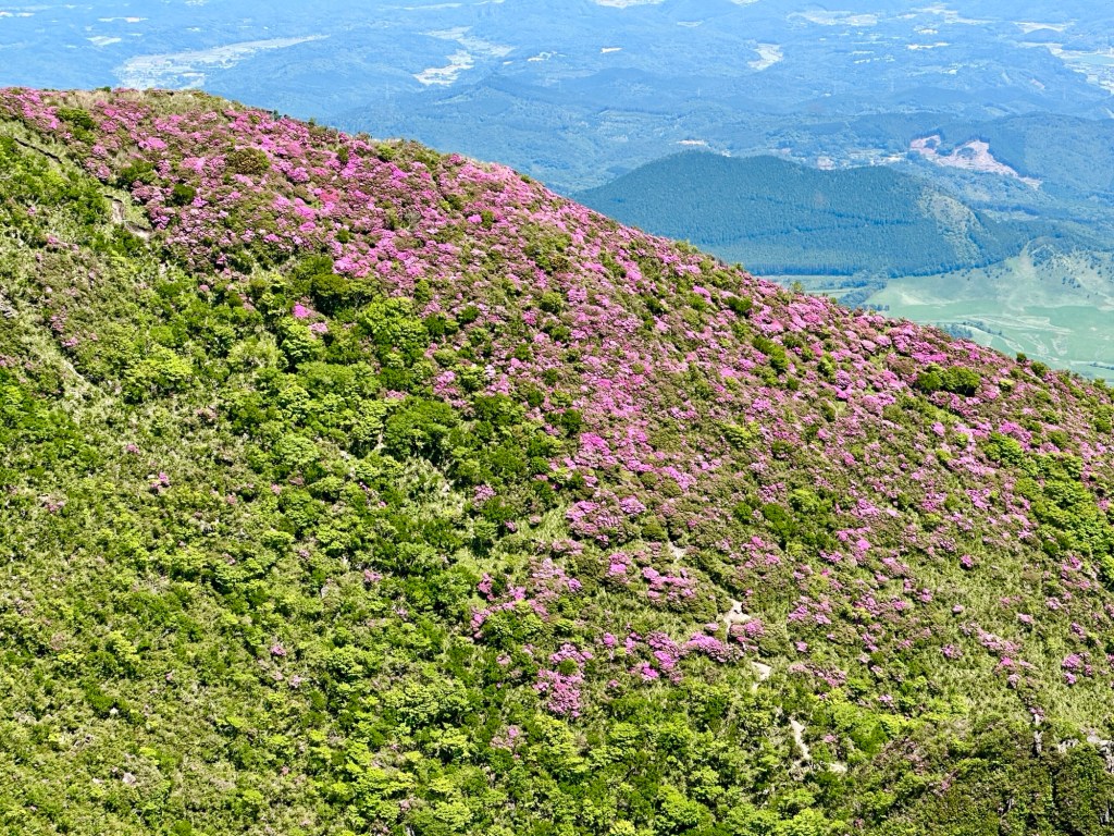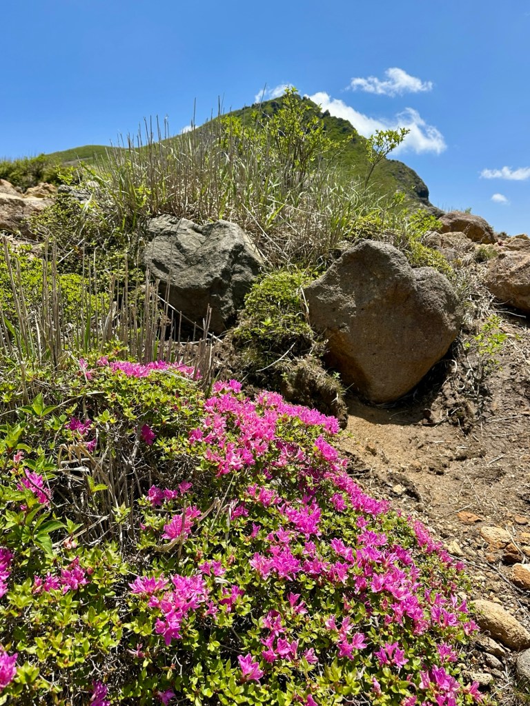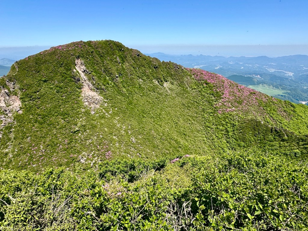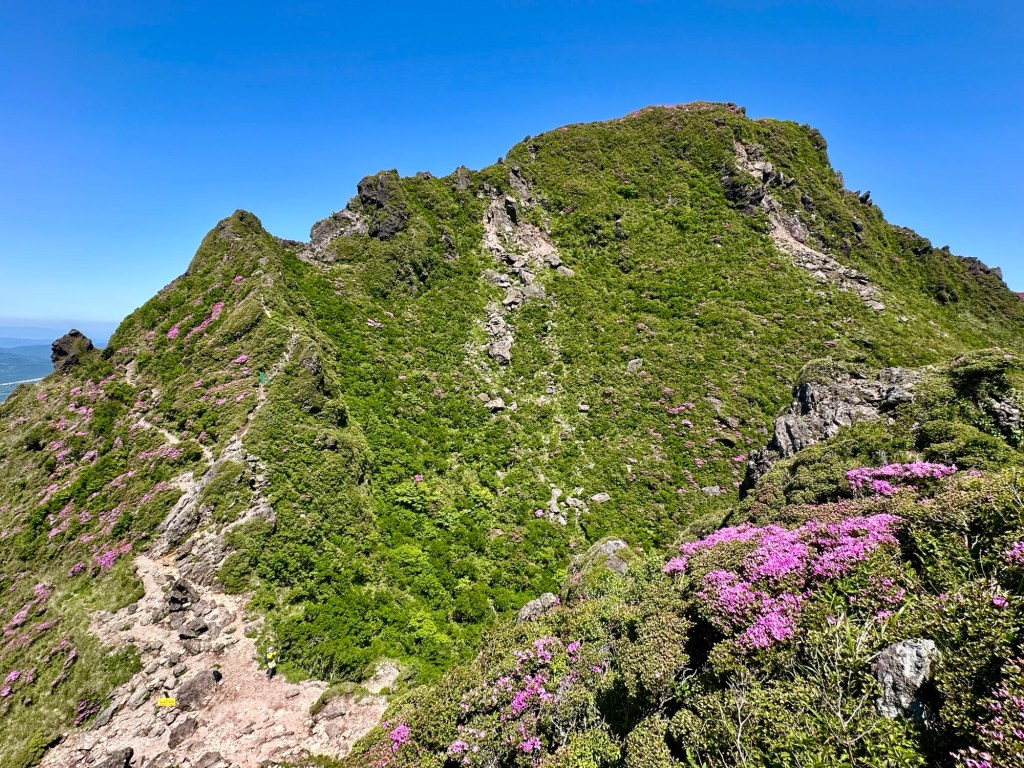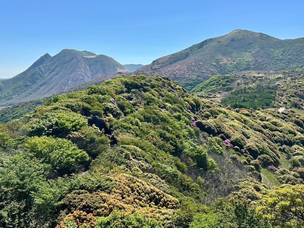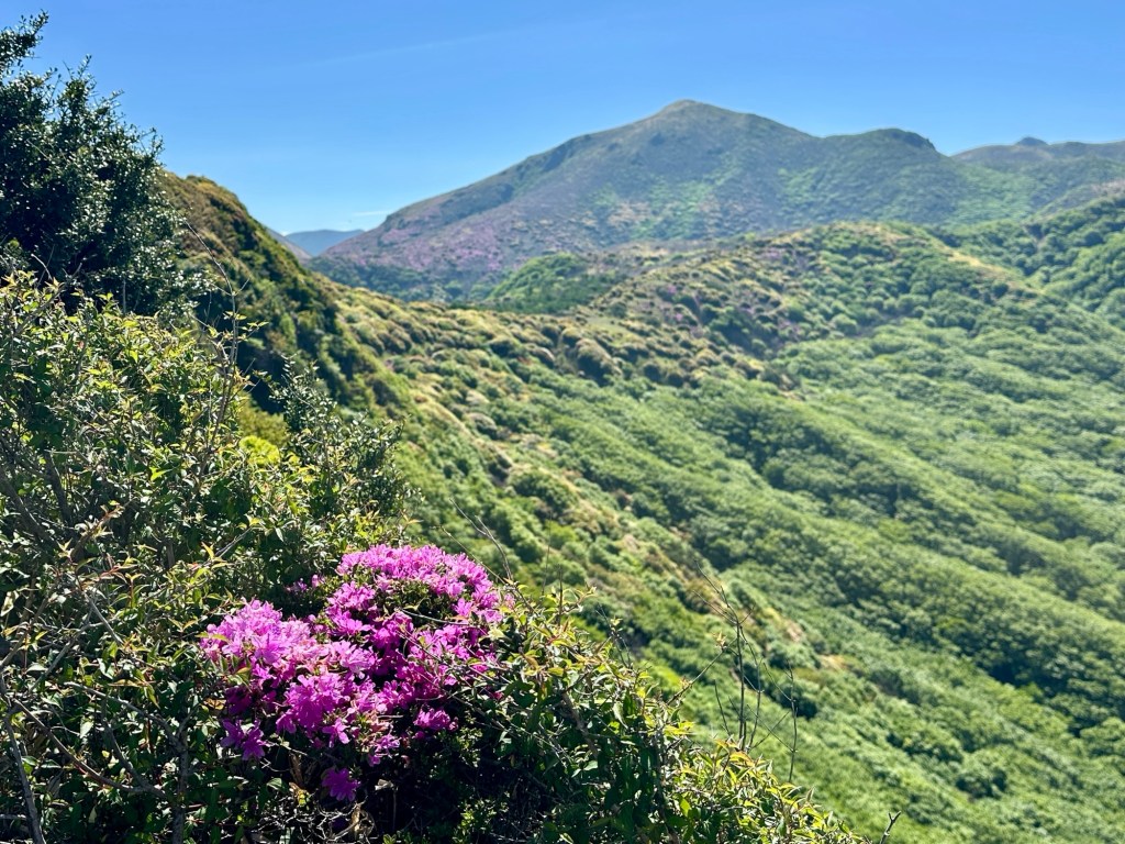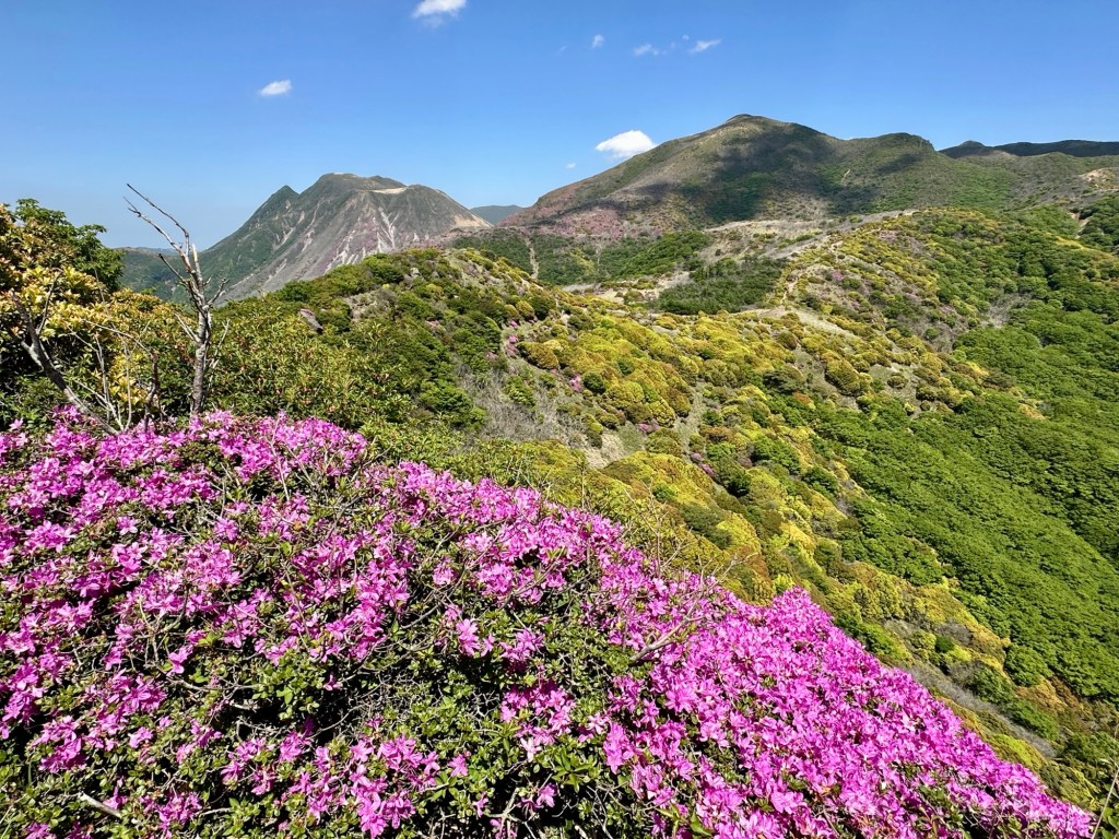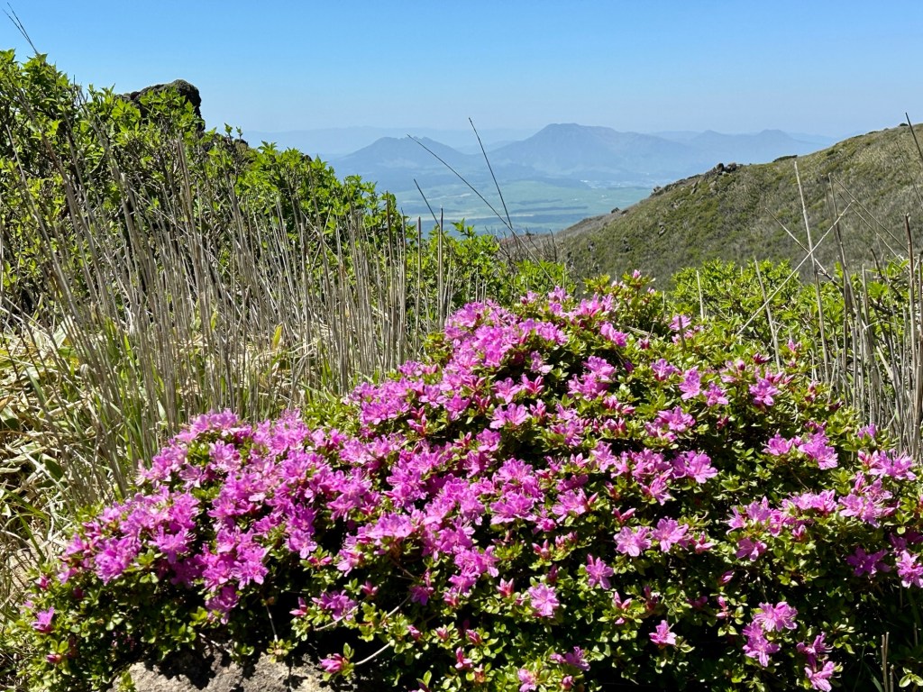 平日で雨上がりと言うこともあり一般登山者は少なめでしたが、幼稚園園児?の一行は扇ヶ鼻へと向かっていました。天気は良かったのですが、風が強く吹いていて久住山山頂では岩陰で風を避けつつ展望を楽しみながら昼食を頂きました。下山は往路と同じルートで下山しました。ミヤマキリシマの開花状況は全体的にはまだ2〜3分咲きといった感じでした。下山後は翌日の由布岳登山に備え湯布院温泉にて宿泊、ホッコリしました。最終日は正面登山口から東峰を目指し登りました。由布岳は麓から見ると新緑のグリーンが輝いていて山頂が近くになるにつれて開花し始めたミヤマキリシマが山の斜面にパッチワークのように咲いていて綺麗でした。なお、東峰山頂からお鉢巡りコースを見ると西峰から通称、ゴジラの背へと下る斜面が満開のミヤマキリシマでピンク色に染まっていて存在感たっぷりといった感じでした。下山も足元に気をつけてながら無事下山、下山後は湯布院温泉にて温泉入浴してから帰路へとついて頂きました。雨天あり、花畑あり、新緑ありと変化に富んだ九州本土の山歩きを楽しんで頂けたと思います!