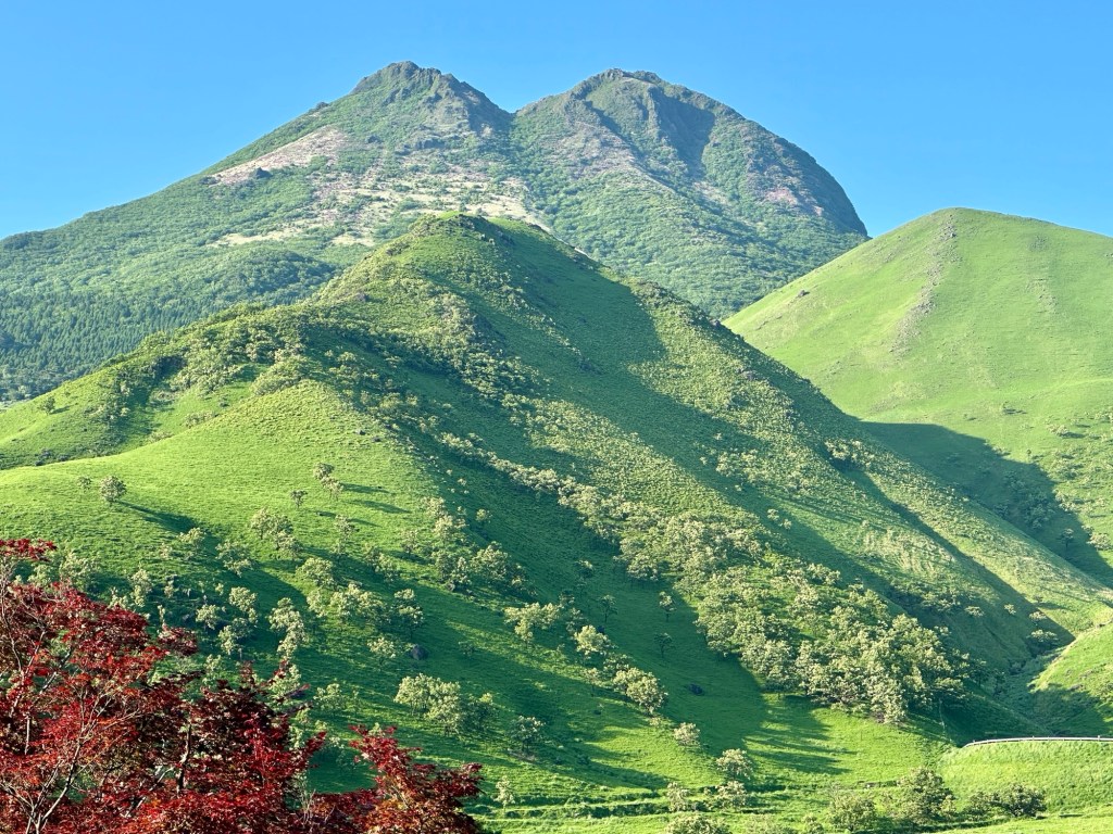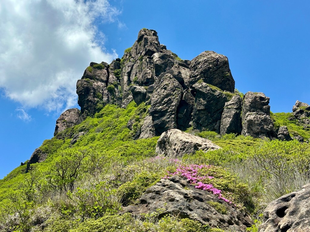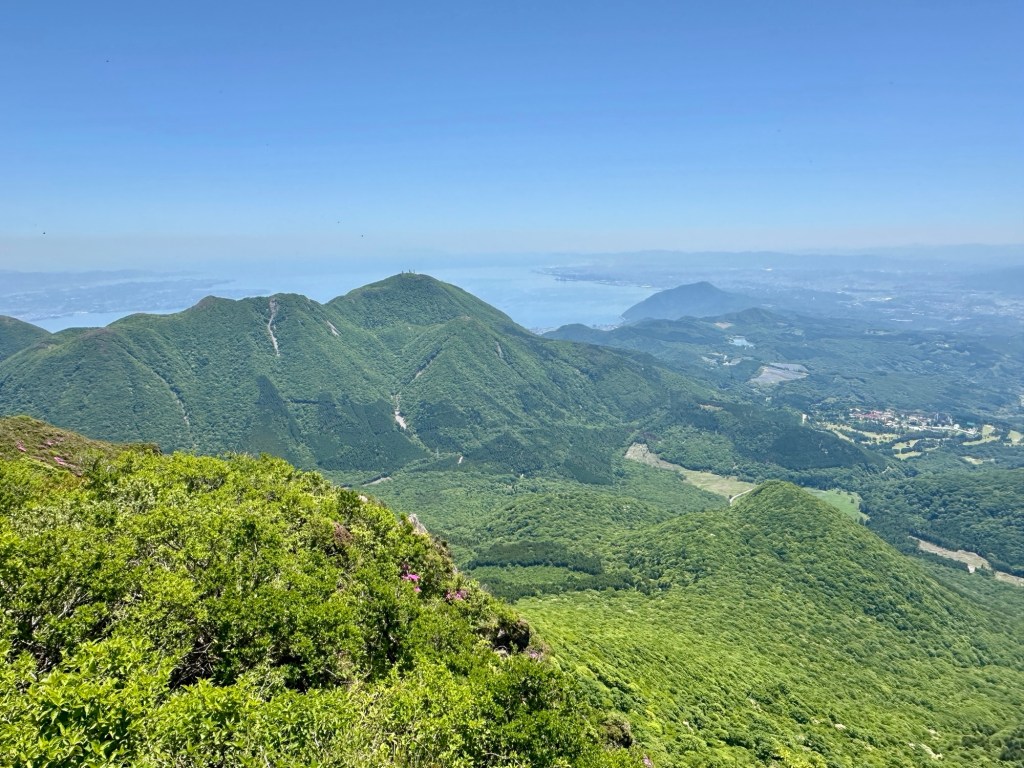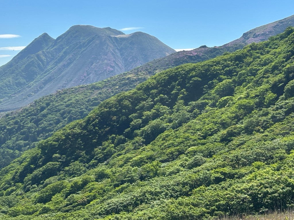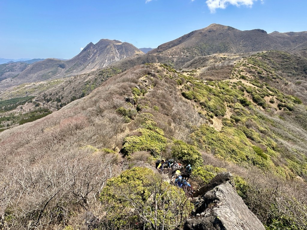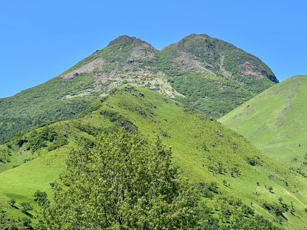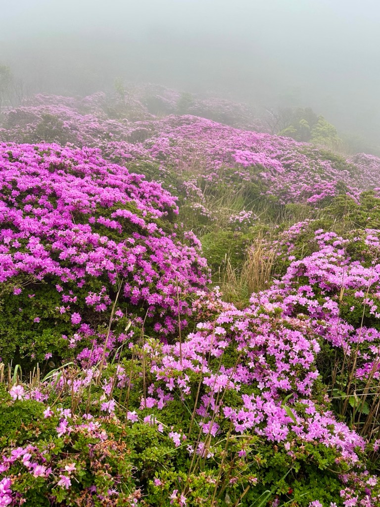 平日で雨上がりと言うこともあり一般登山者は少なめでしたが、幼稚園園児?の一行は扇ヶ鼻へと向かっていました。天気は良かったのですが、風が強く吹いていて久住山山頂では岩陰で風を避けつつ展望を楽しみながら昼食を頂きました。下山は往路と同じルートで下山しました。ミヤマキリシマの開花状況は全体的にはまだ2〜3分咲きといった感じでした。下山後は翌日の由布岳登山に備え湯布院温泉にて宿泊、ホッコリしました。最終日は正面登山口から東峰を目指し登りました。由布岳は麓から見ると新緑のグリーンが輝いていて山頂が近くになるにつれて開花し始めたミヤマキリシマが山の斜面にパッチワークのように咲いていて綺麗でした。なお、東峰山頂からお鉢巡りコースを見ると西峰から通称、ゴジラの背へと下る斜面が満開のミヤマキリシマでピンク色に染まっていて存在感たっぷりといった感じでした。下山も足元に気をつけてながら無事下山、下山後は湯布院温泉にて温泉入浴してから帰路へとついて頂きました。雨天あり、花畑あり、新緑ありと変化に富んだ九州本土の山歩きを楽しんで頂けたと思います!