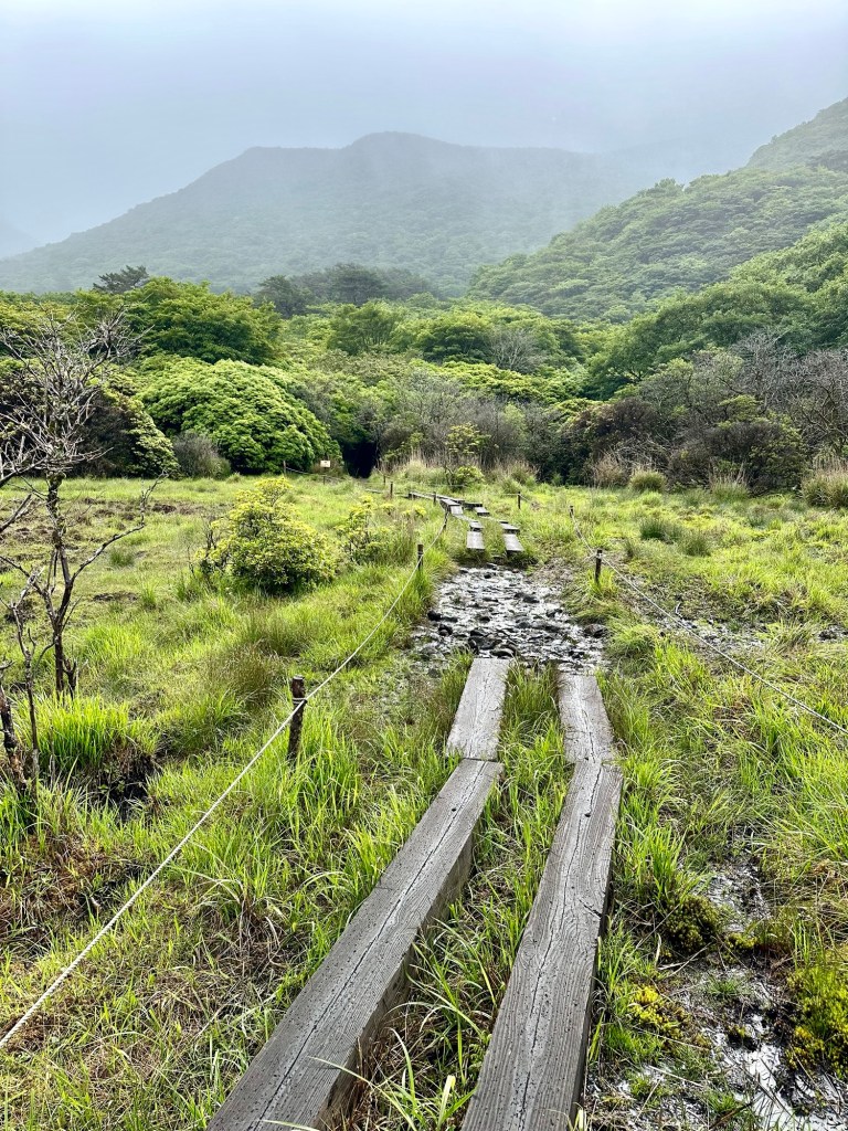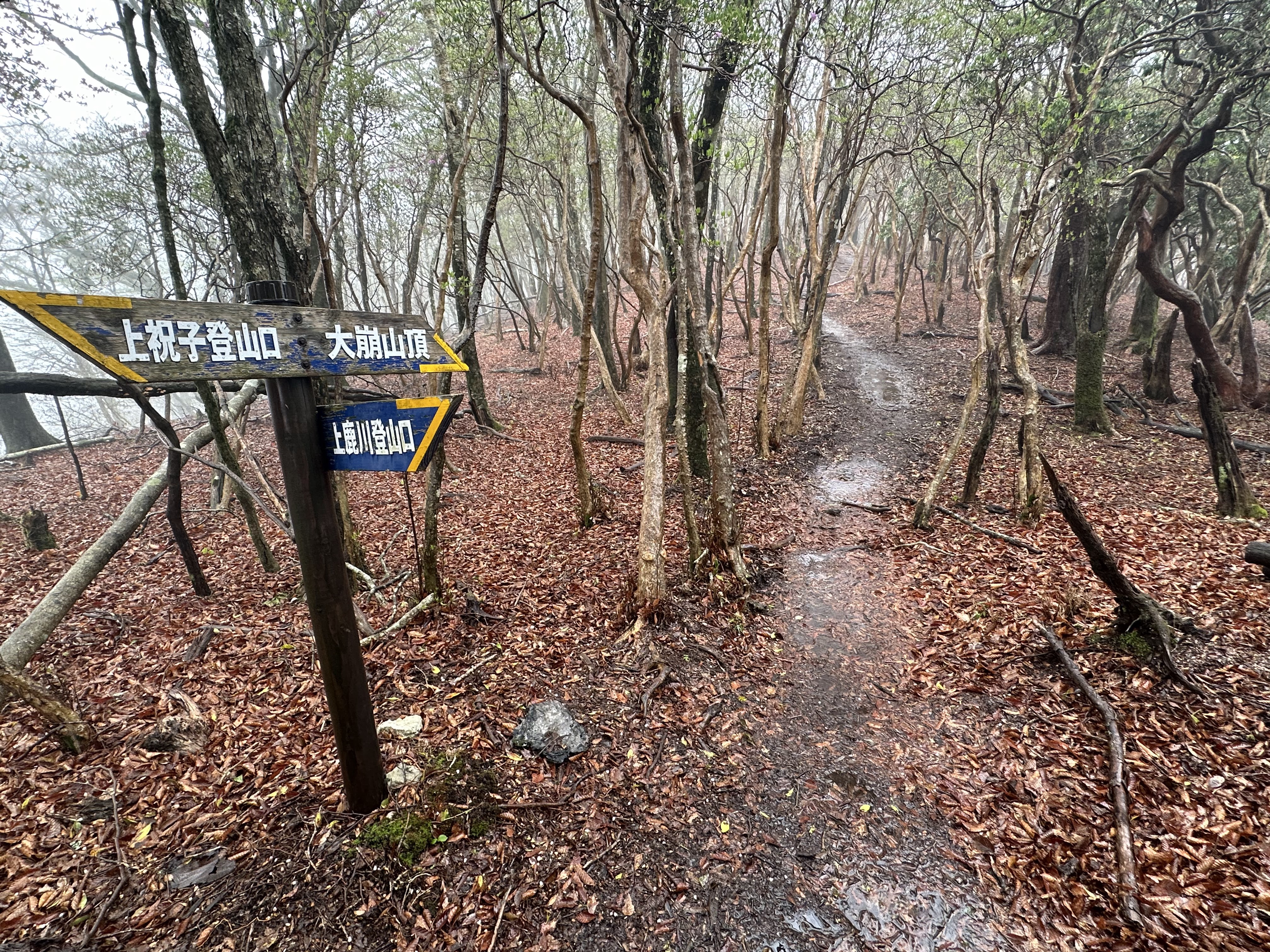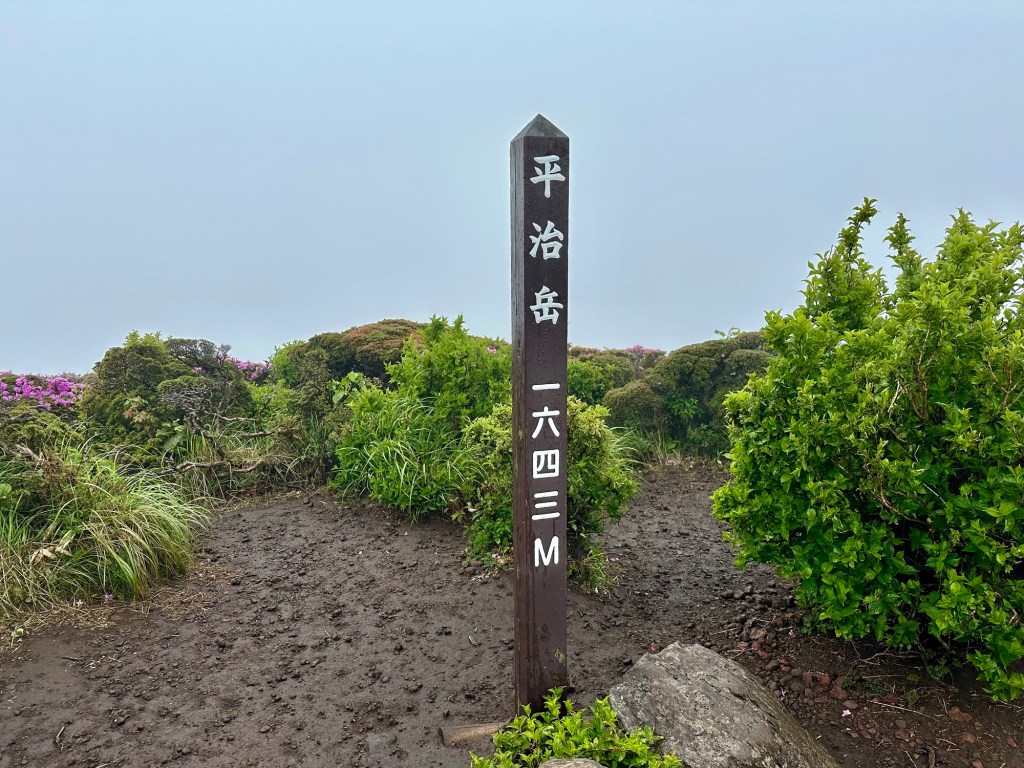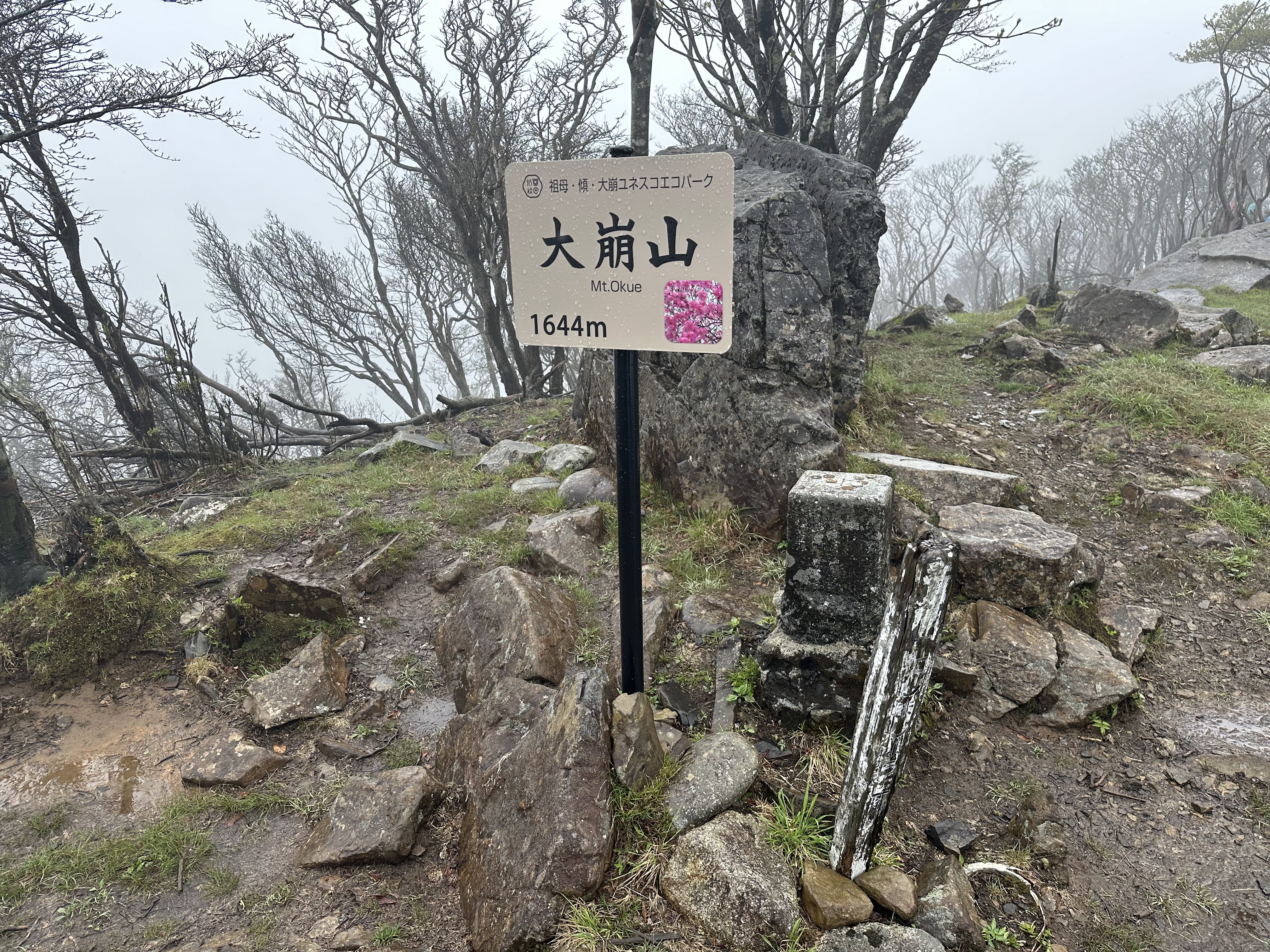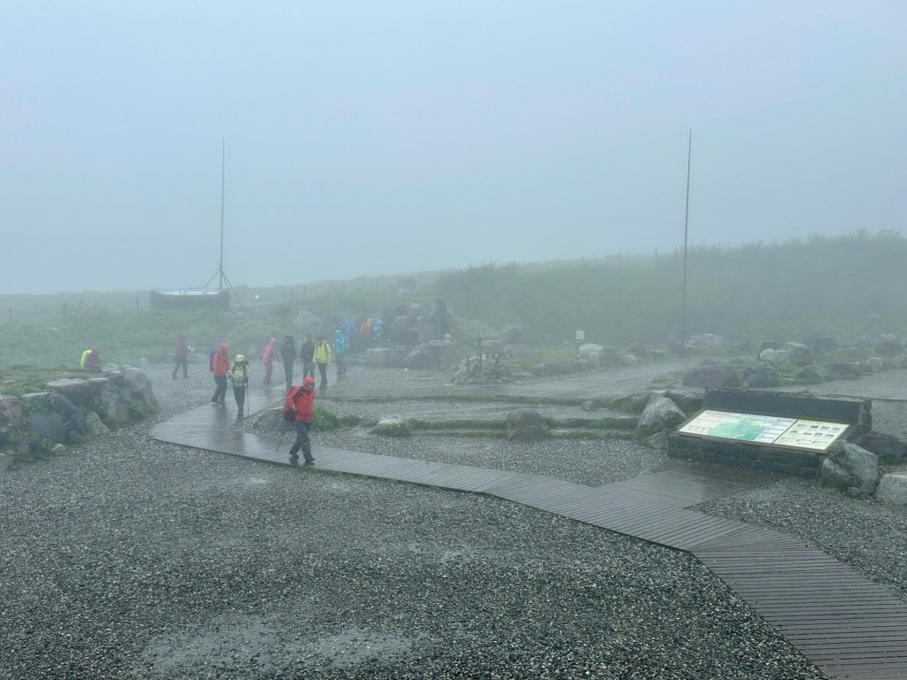 開聞岳山頂に到着。天気が良ければ素晴らしい展望を楽しめますが今回は残念ながらガスガスでした(泣)下山は往路を戻ることになります。
