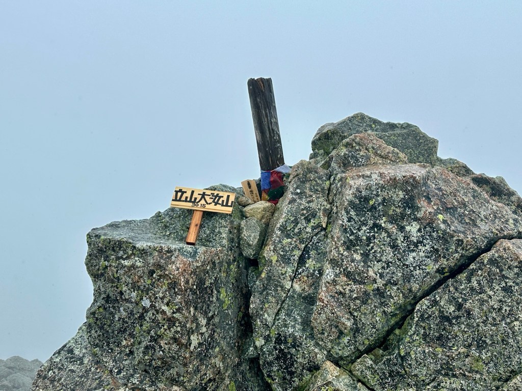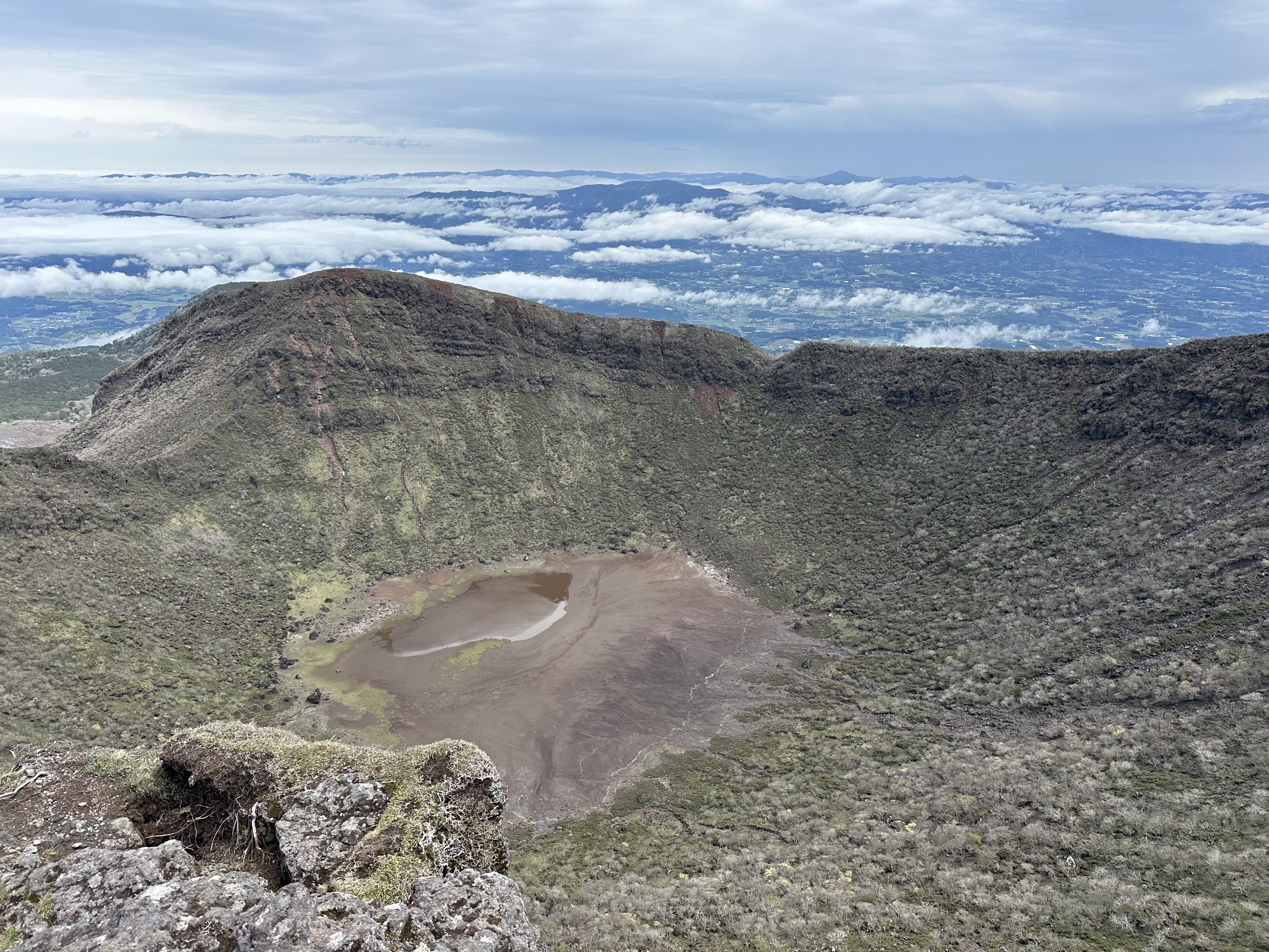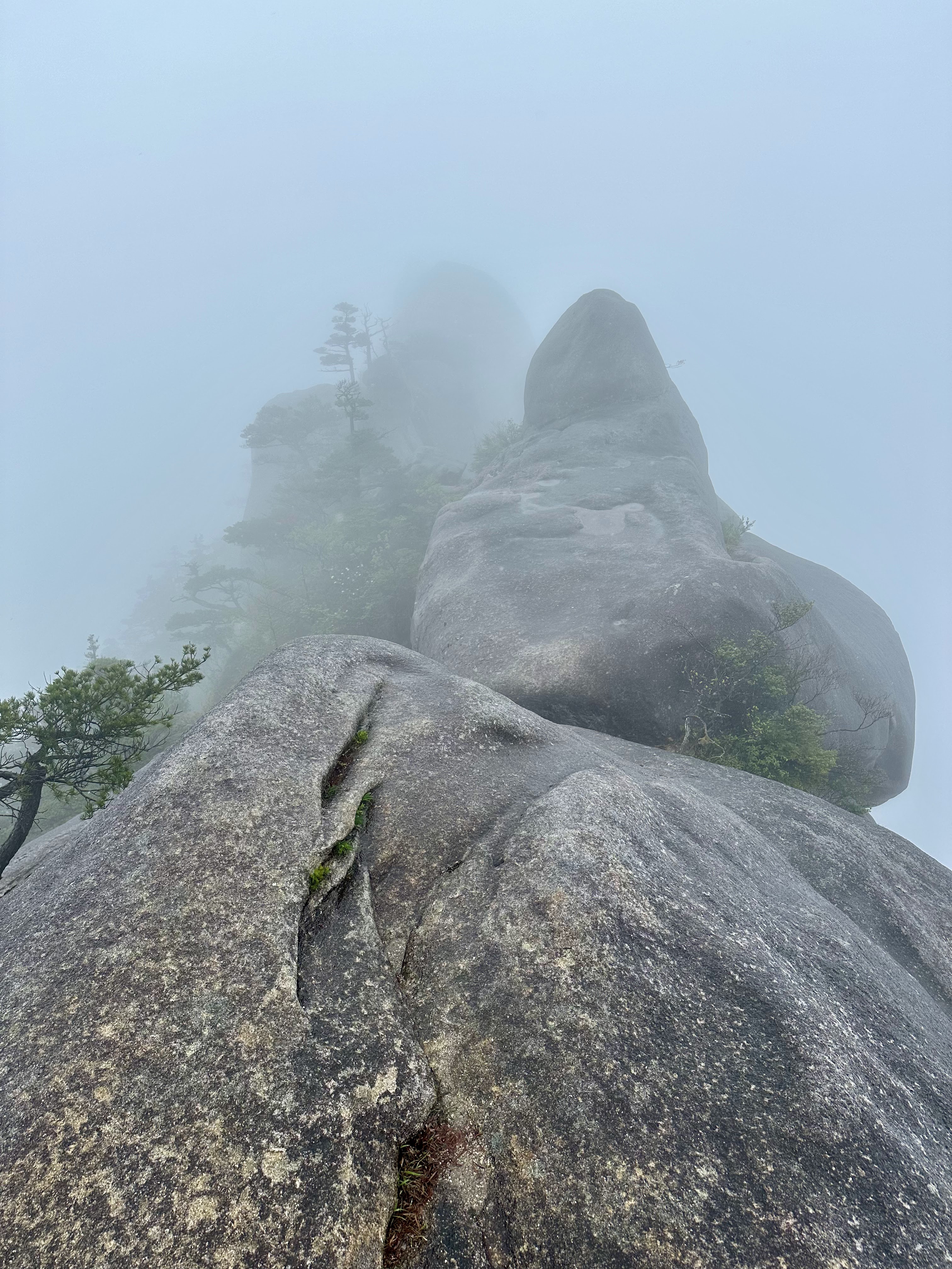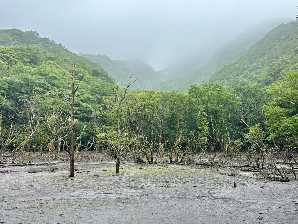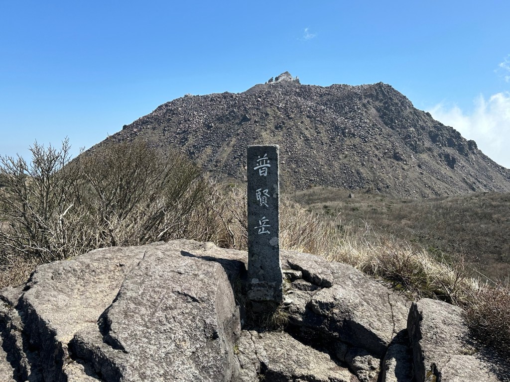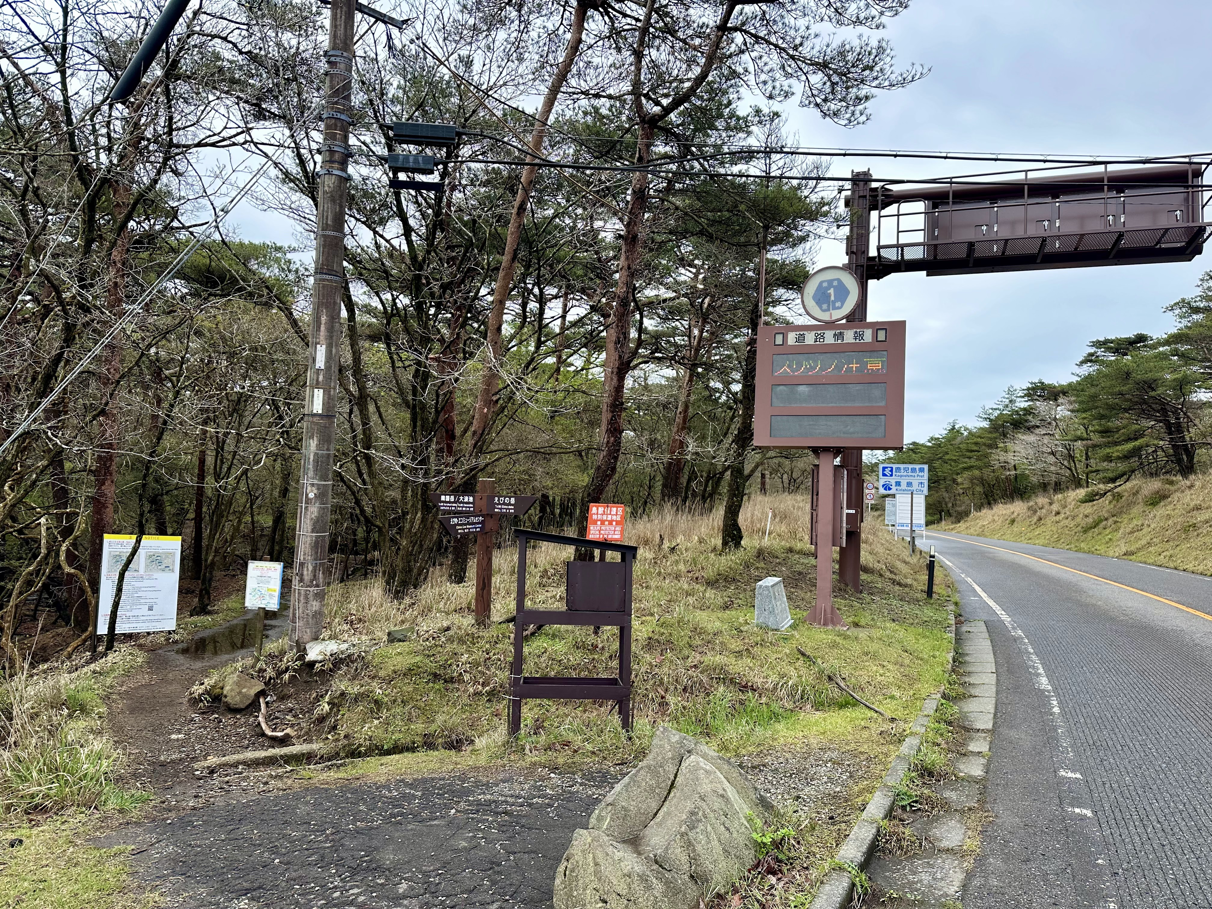 開聞岳山頂に到着。天気が良ければ素晴らしい展望を楽しめますが今回は残念ながらガスガスでした(泣)下山は往路を戻ることになります。