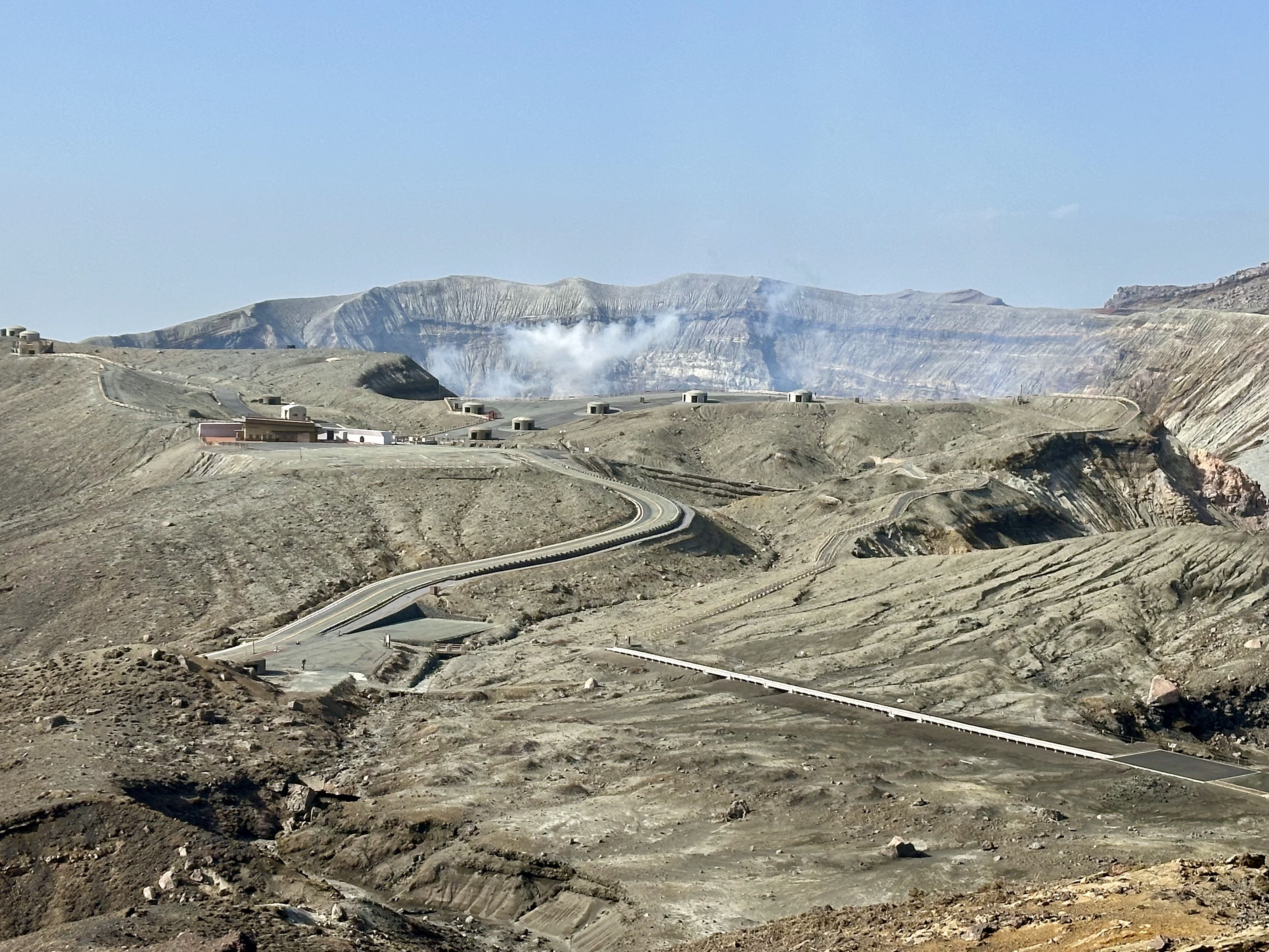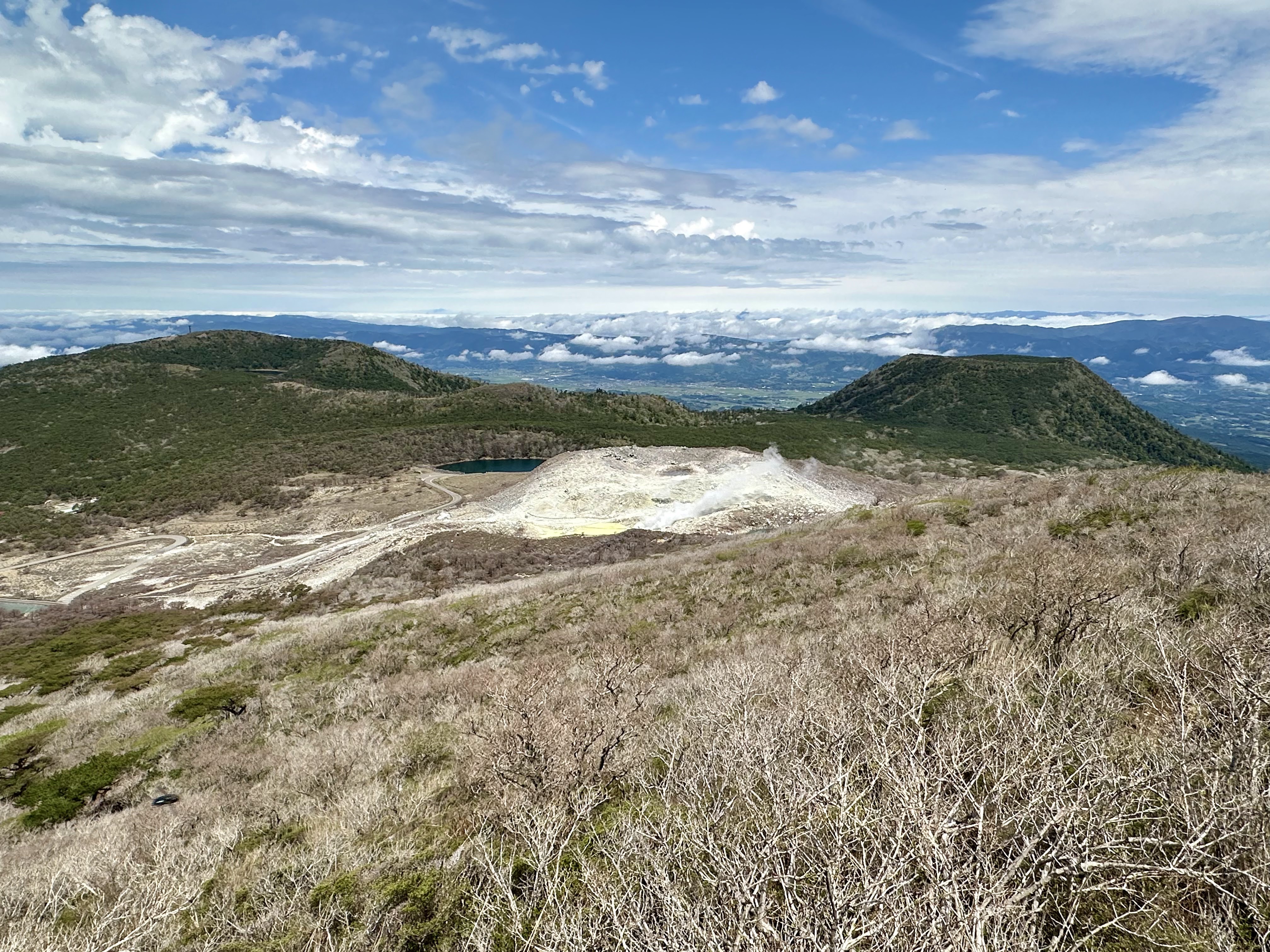 硫黄山火口展望所から眼下の白い所が硫黄山、左奥は白鳥山・右側は甑岳になります。