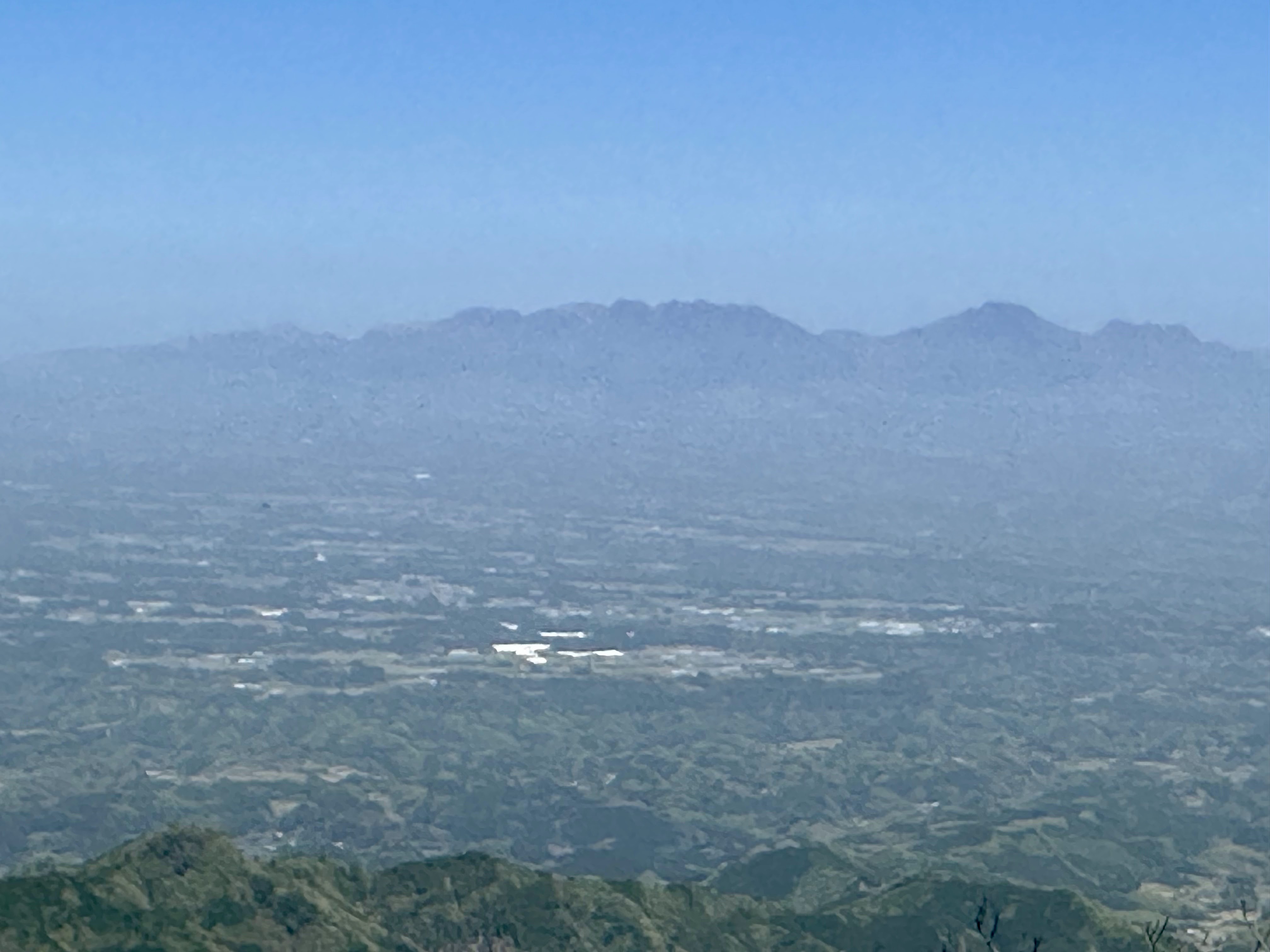 山頂からは北東方面に次に登る中岳(双児峰の右側)が見えています。右奥に大船山、左奥遠くに由布岳が見えています。