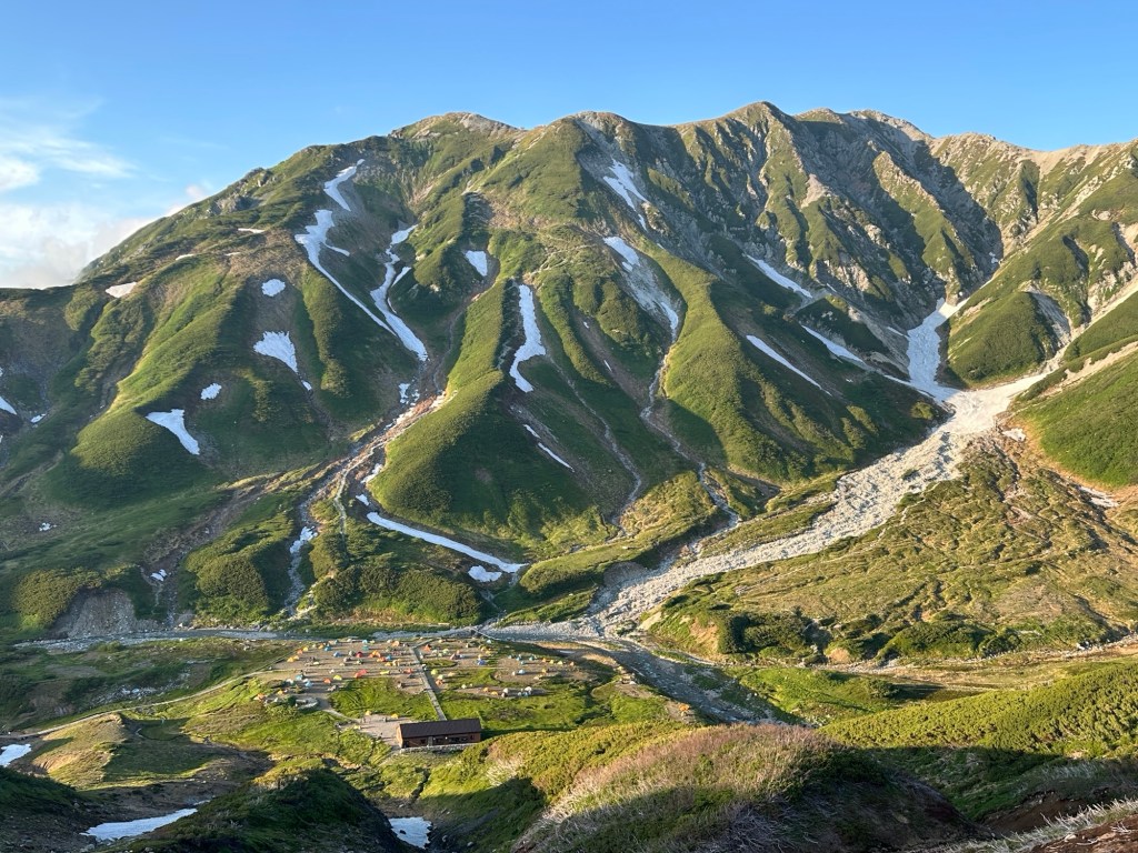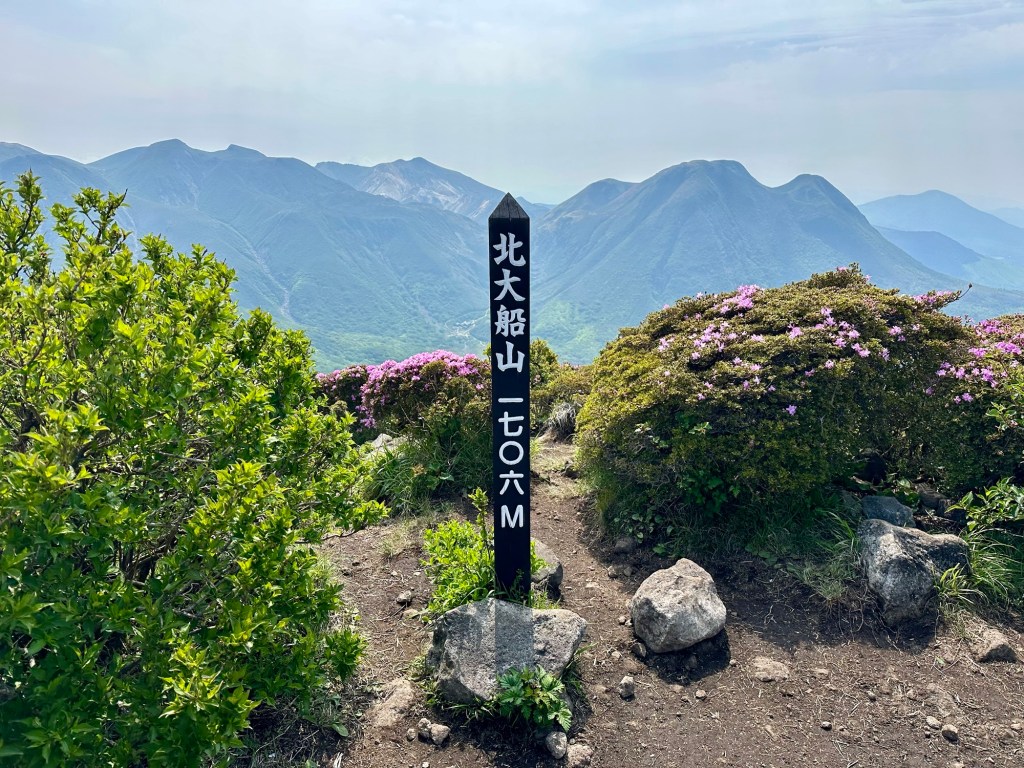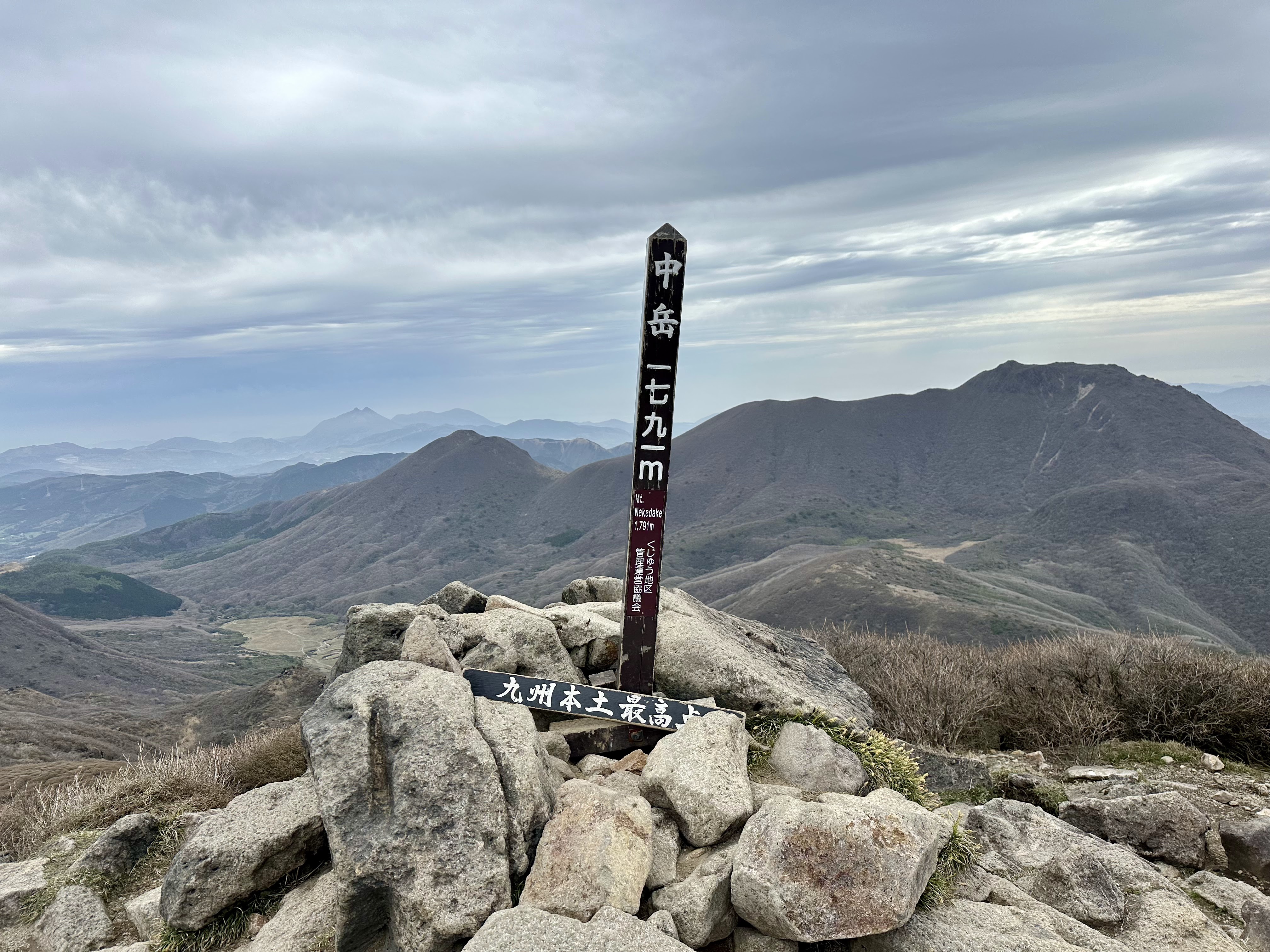 九州本土最高峰 中岳に登頂!眼下には坊ガツルの草原、その先に大船山・平治岳などの峰々が見えています。