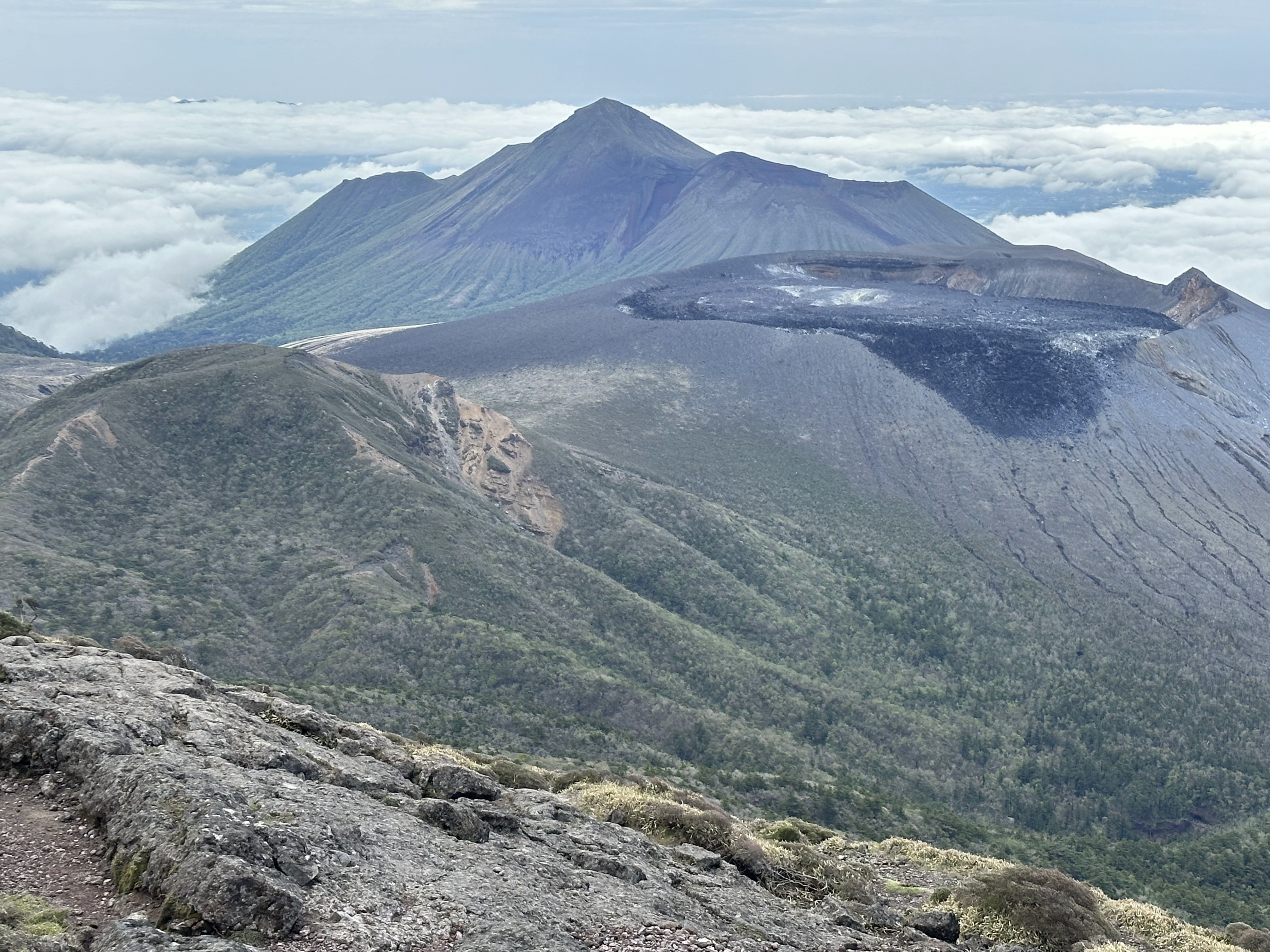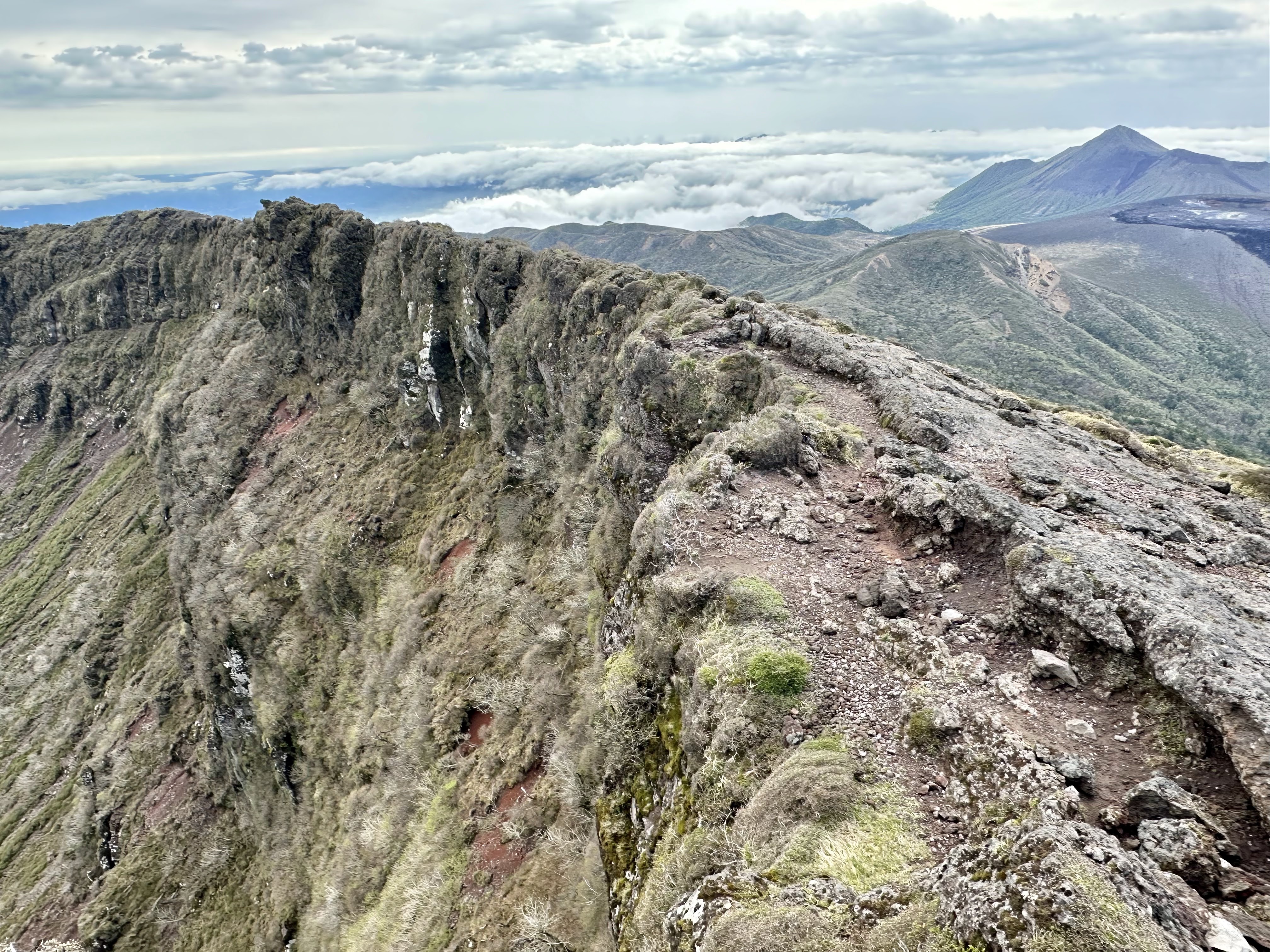 韓国岳山頂から南に高千穂峰方面縦走路が綺麗に見えます。右側の黒く平になった山は新燃岳で未だ火山活動を続けています。
