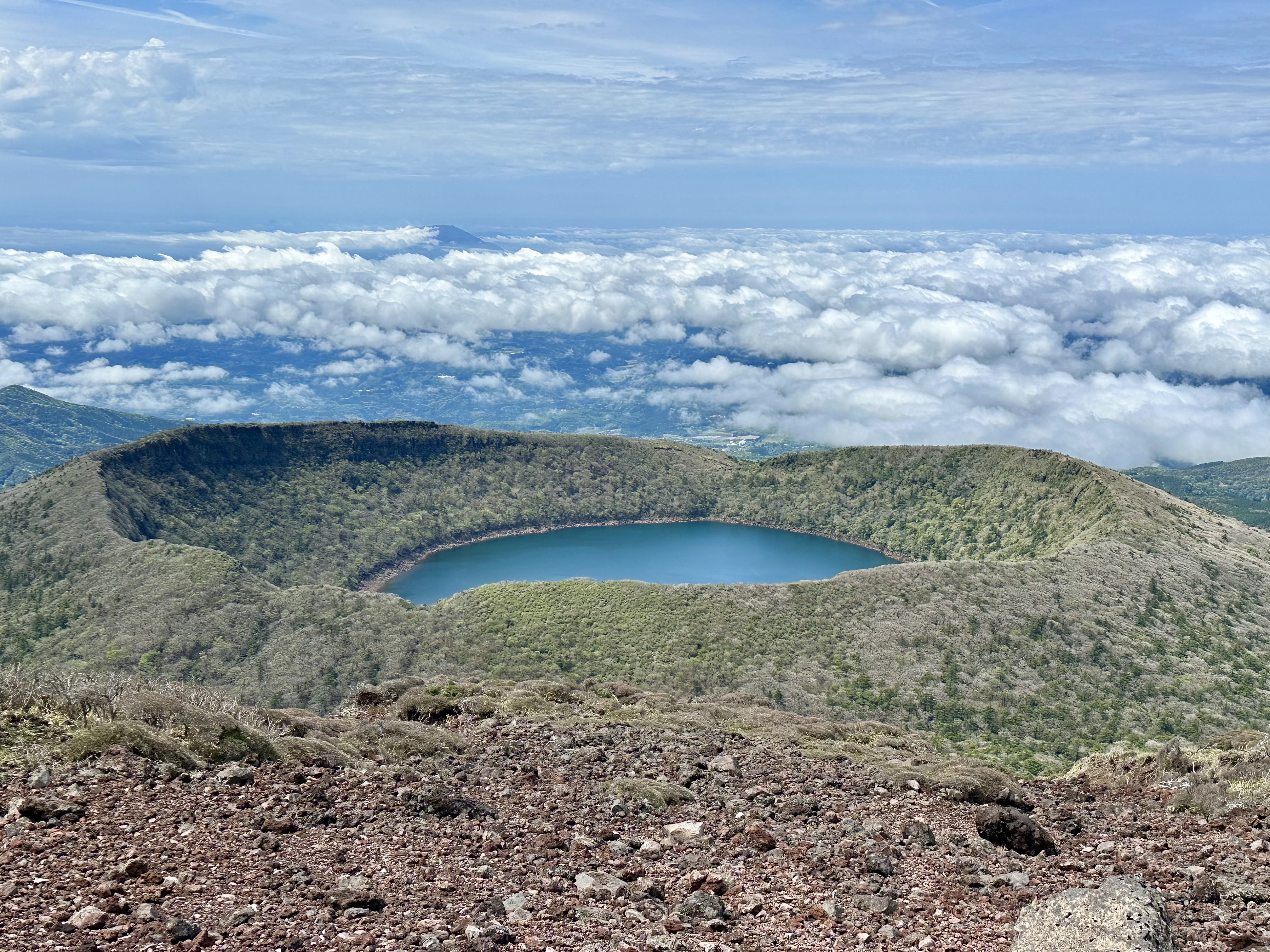 韓国岳避難小屋から山頂間は急傾斜地の階段状の登山道が続きます。眼下には綺麗な姿の大浪池(火口湖)が見えています。