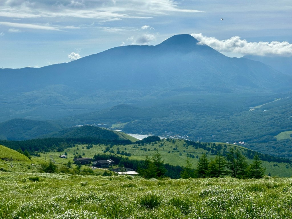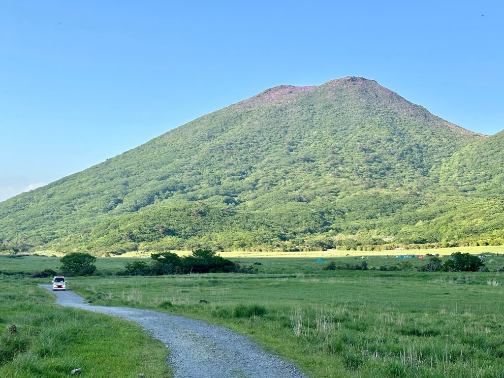 下山後、えびの高原駐車場から登った韓国岳(右側奥)を望んで。5日間の登山が無事終了、九州五座を巡るツアーは個人では移動その他が大変ですがツアー登山であれば効率よく巡ることが出来、毎年人気のツアーとなっています!